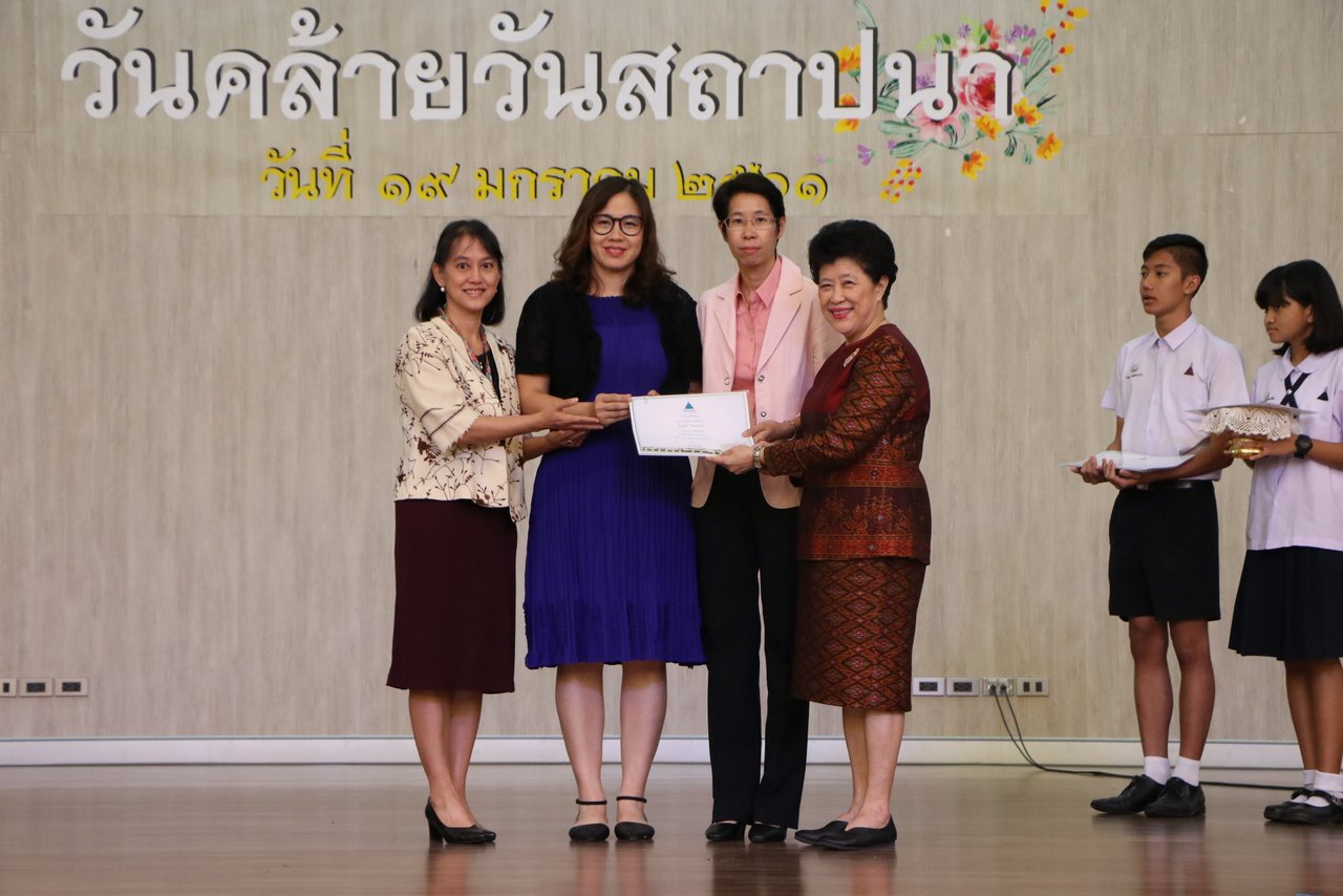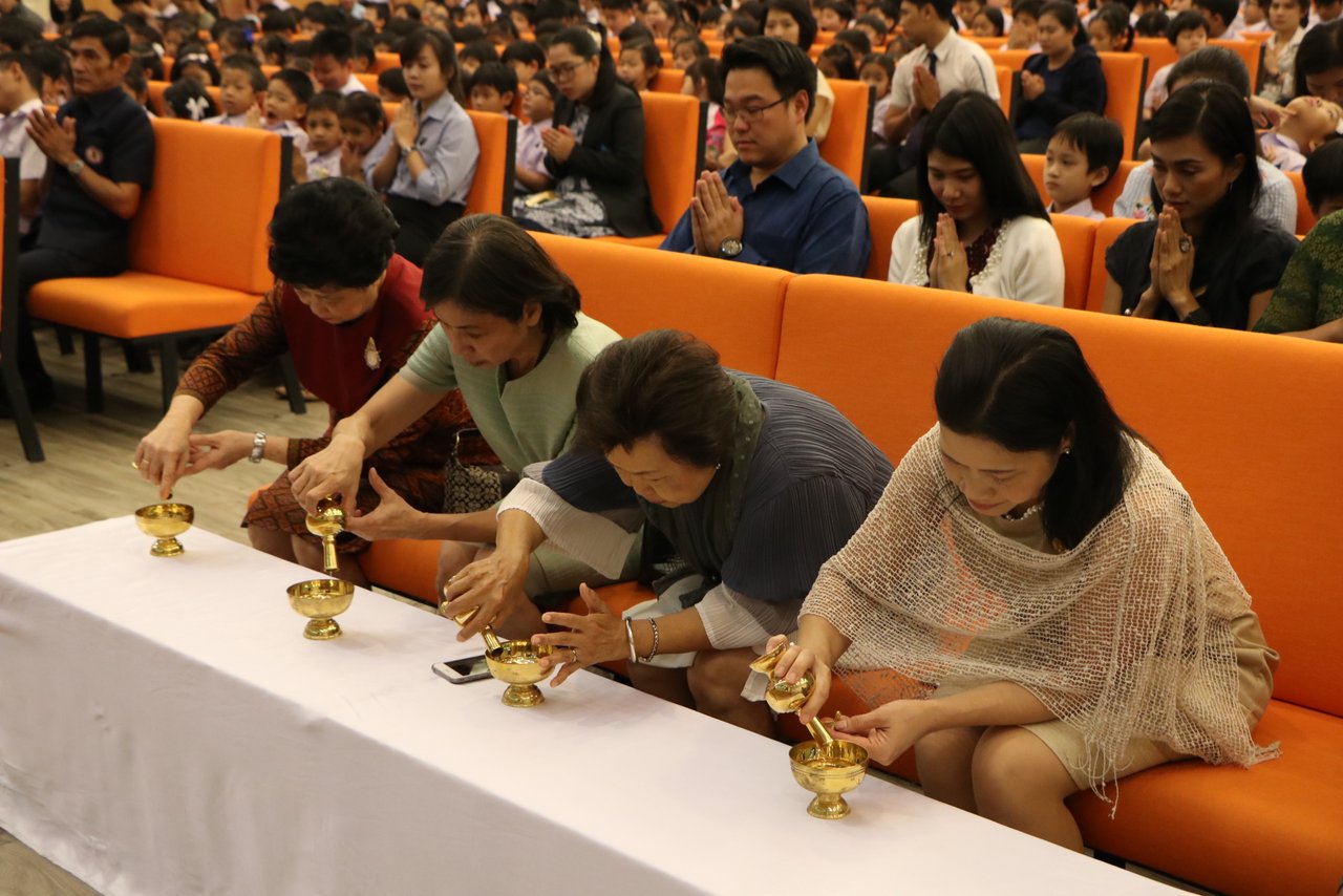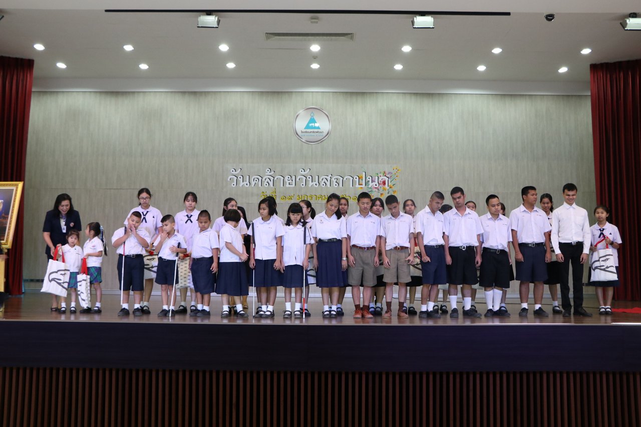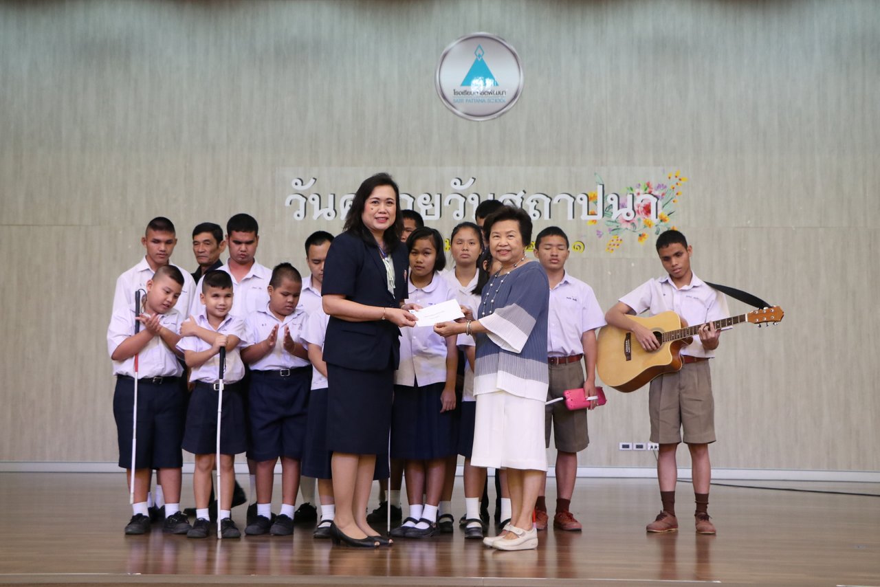 จากนั้น รศ.สมศรี รองผู้อำนวยการได้มอบเงินบริจาคให้กับตัวแทนจากมูลนิธิสายธารแห่งความหวัง และมูลนิธิธรรมิกชนเพื่อคนตาบอดในประเทศไทย ในพระบรมราชูปถัมภ์ ซึ่งน้องๆ ผู้พิการทางสายตา เล่นดนตรีและร้องเพลงให้ทุกคนฟังเพื่อแสดงความขอบคุณในการช่วยสนับสนุนทุนทรัพย์ ต่อด้วยกิจกรรมเซอร์ไพรส์จากสภานักเรียน มอบเค้กวันเกิดเพื่อร่วมยินดีกับการเจริญเติบโตก้าวหน้าของโรงเรียน โดยนักเรียนได้มอบเค้กต่อให้กับน้องๆ ผู้พิการทางสายตาเพื่อส่งต่อความสุขไปให้ผู้อื่นได้ไม่รู้จบเสร็จพิธีด้วยความเป็นสิริมงคลและความภาคภูมิใจของทุกคน ที่พร้อมมุ่งมั่นทำหน้าที่ของตนเองให้ดีที่สุดในการก้าวสู่ปีที่ 12 อย่างมั่นคงและเจริญงอกงาม