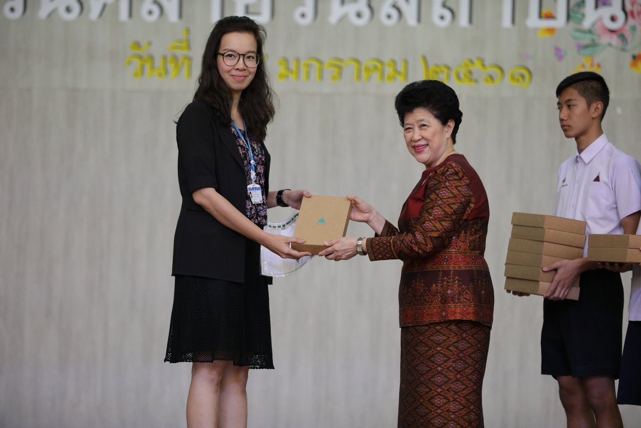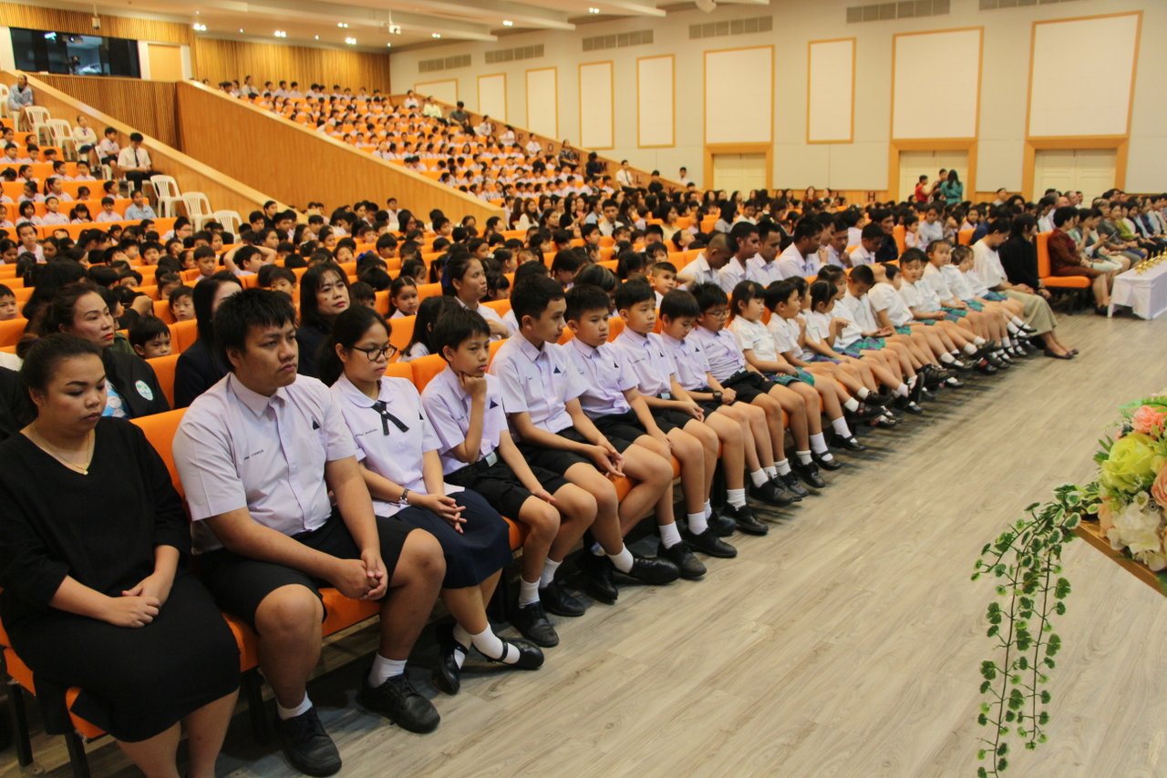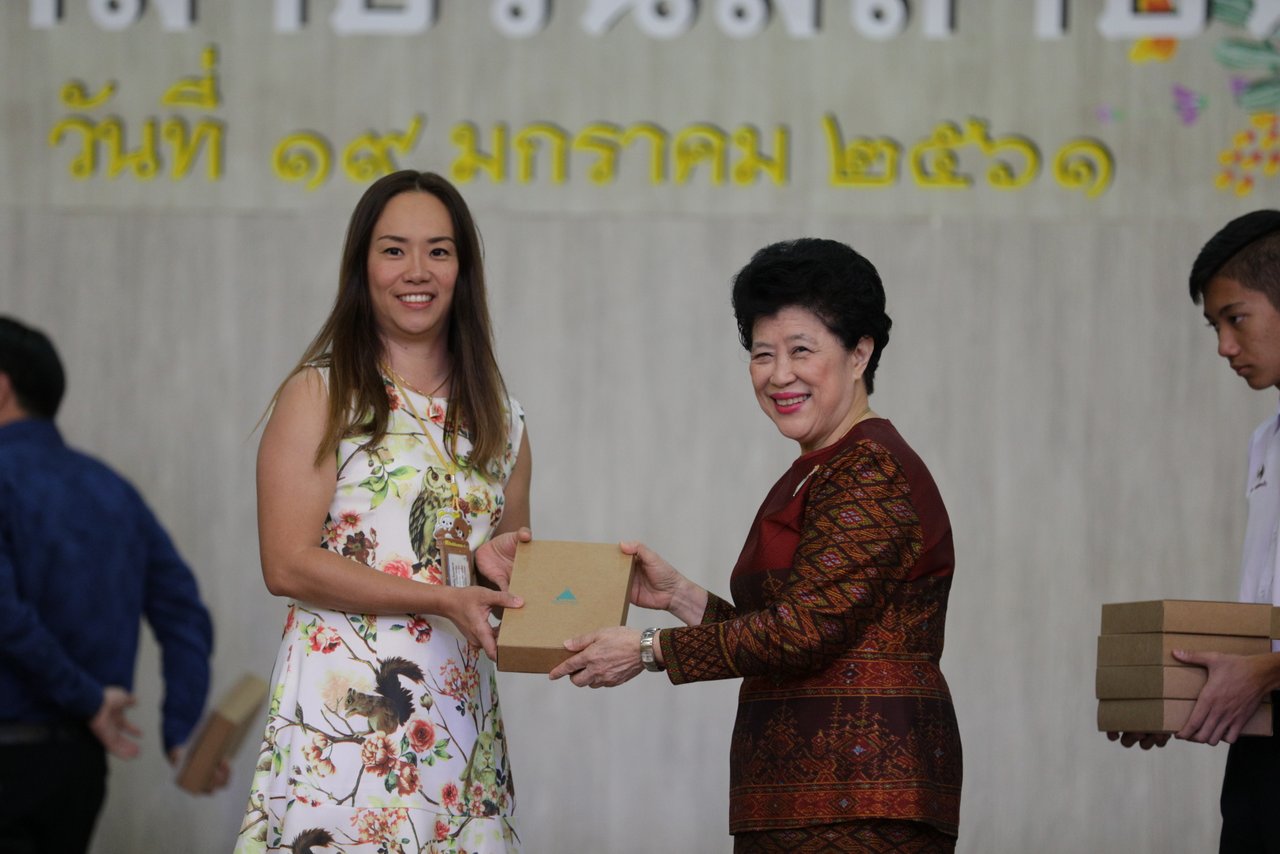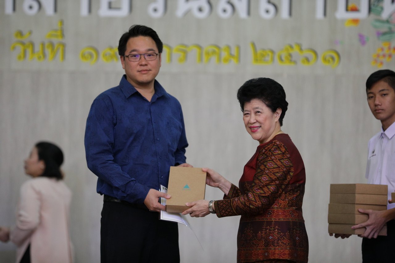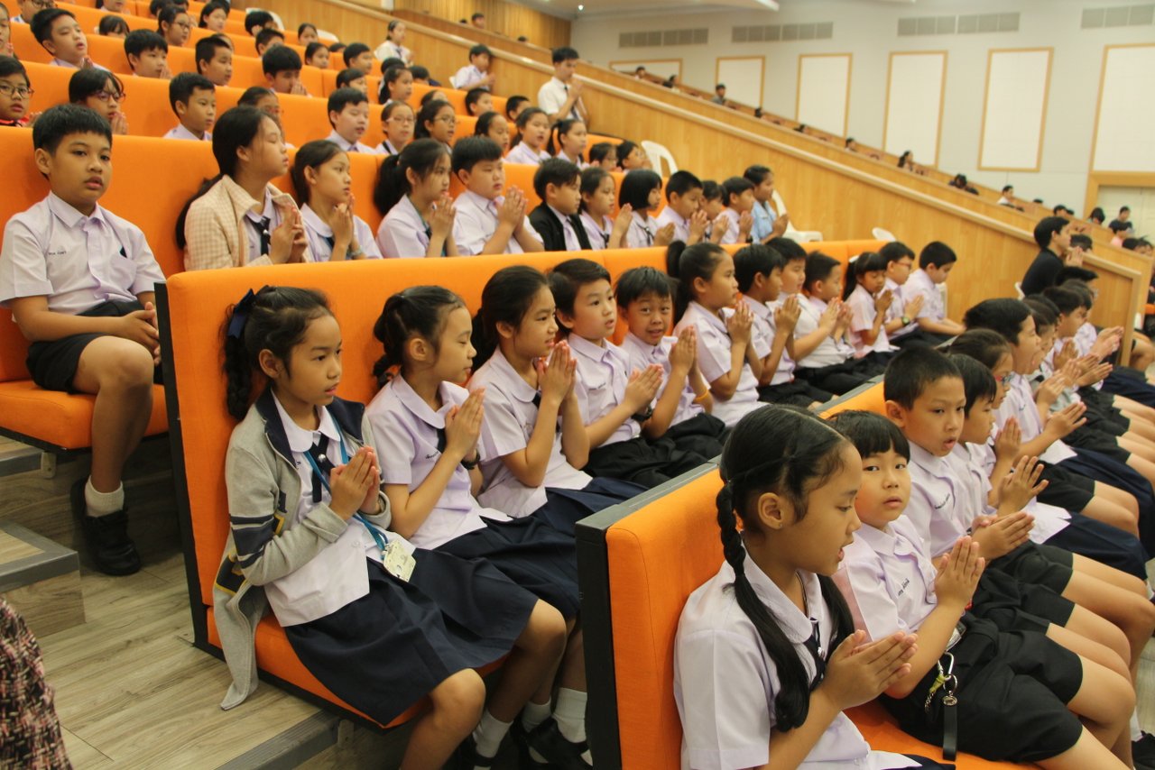 จากนั้น รศ.สมศรี รองผู้อำนวยการได้มอบเงินบริจาคให้กับตัวแทนจากมูลนิธิสายธารแห่งความหวัง และมูลนิธิธรรมิกชนเพื่อคนตาบอดในประเทศไทย ในพระบรมราชูปถัมภ์ ซึ่งน้องๆ ผู้พิการทางสายตา เล่นดนตรีและร้องเพลงให้ทุกคนฟังเพื่อแสดงความขอบคุณในการช่วยสนับสนุนทุนทรัพย์ ต่อด้วยกิจกรรมเซอร์ไพรส์จากสภานักเรียน มอบเค้กวันเกิดเพื่อร่วมยินดีกับการเจริญเติบโตก้าวหน้าของโรงเรียน โดยนักเรียนได้มอบเค้กต่อให้กับน้องๆ ผู้พิการทางสายตาเพื่อส่งต่อความสุขไปให้ผู้อื่นได้ไม่รู้จบเสร็จพิธีด้วยความเป็นสิริมงคลและความภาคภูมิใจของทุกคน ที่พร้อมมุ่งมั่นทำหน้าที่ของตนเองให้ดีที่สุดในการก้าวสู่ปีที่ 12 อย่างมั่นคงและเจริญงอกงาม