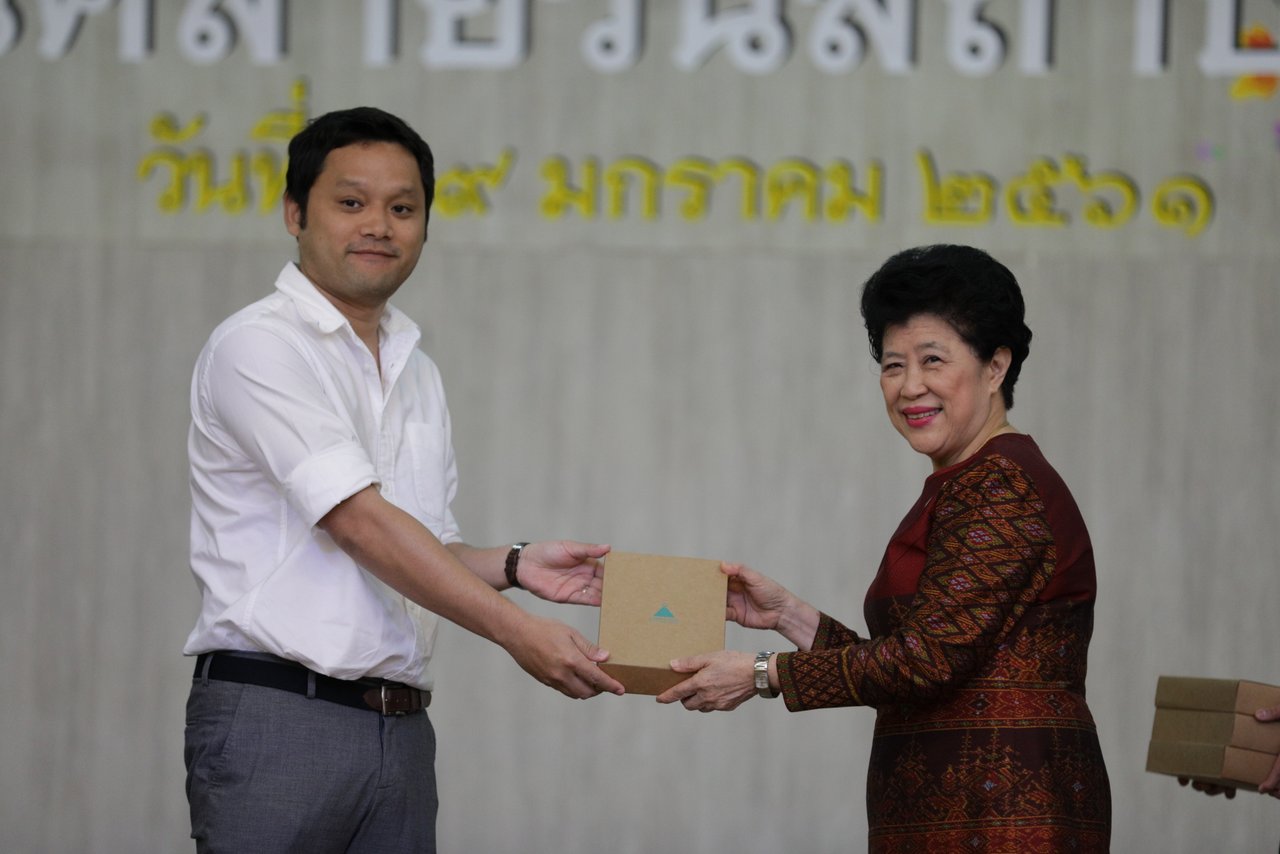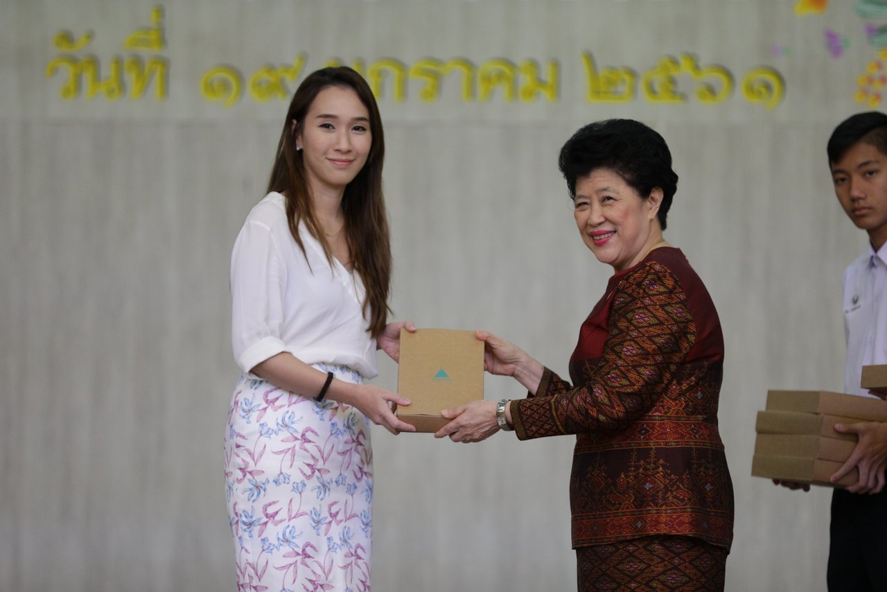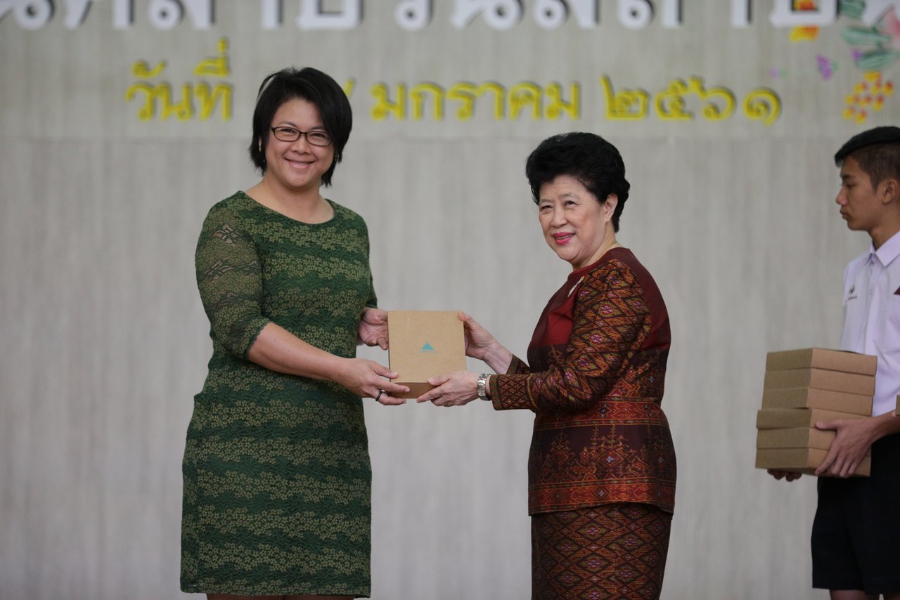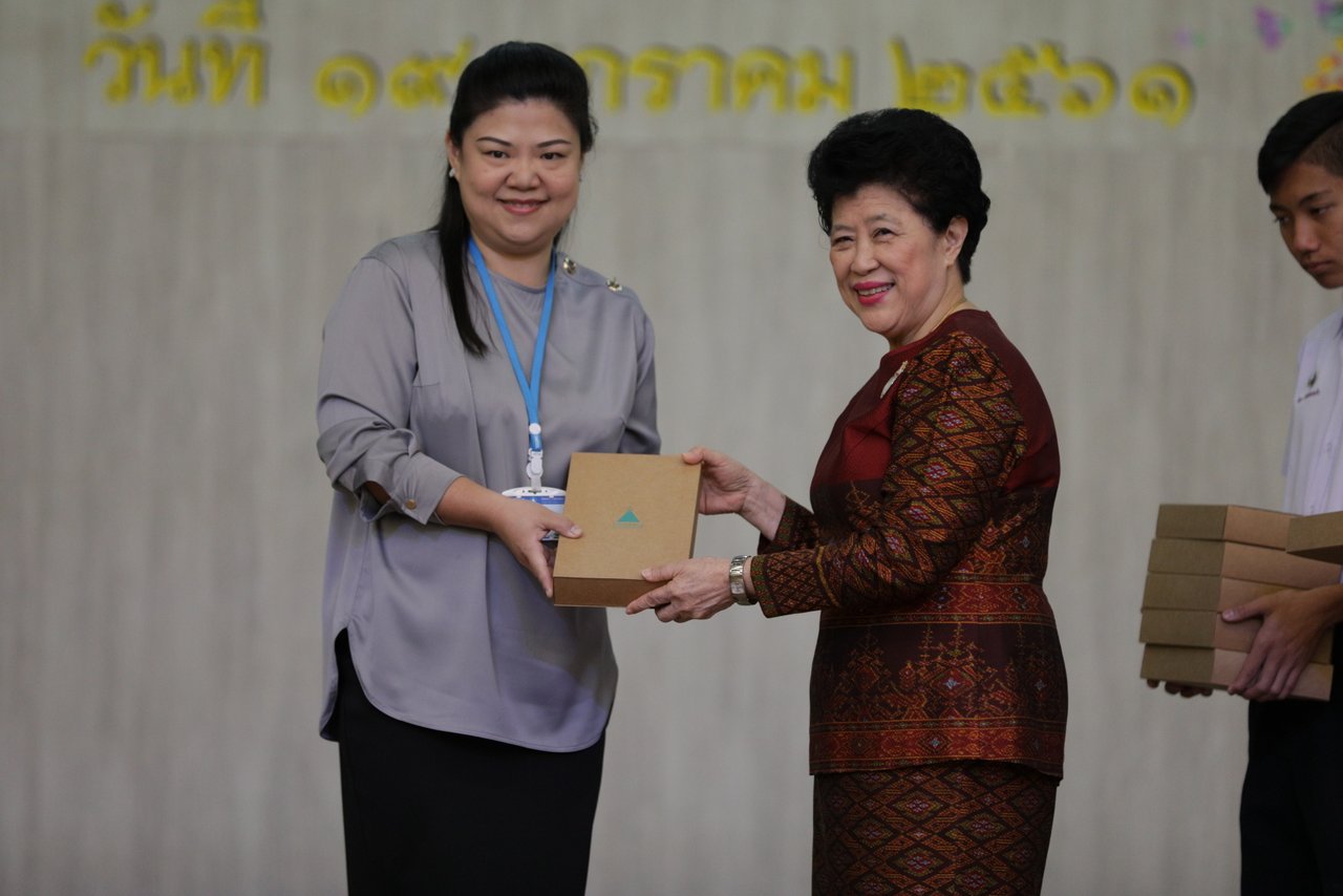 จากนั้น รศ.สมศรี รองผู้อำนวยการได้มอบเงินบริจาคให้กับตัวแทนจากมูลนิธิสายธารแห่งความหวัง และมูลนิธิธรรมิกชนเพื่อคนตาบอดในประเทศไทย ในพระบรมราชูปถัมภ์ ซึ่งน้องๆ ผู้พิการทางสายตา เล่นดนตรีและร้องเพลงให้ทุกคนฟังเพื่อแสดงความขอบคุณในการช่วยสนับสนุนทุนทรัพย์ ต่อด้วยกิจกรรมเซอร์ไพรส์จากสภานักเรียน มอบเค้กวันเกิดเพื่อร่วมยินดีกับการเจริญเติบโตก้าวหน้าของโรงเรียน โดยนักเรียนได้มอบเค้กต่อให้กับน้องๆ ผู้พิการทางสายตาเพื่อส่งต่อความสุขไปให้ผู้อื่นได้ไม่รู้จบเสร็จพิธีด้วยความเป็นสิริมงคลและความภาคภูมิใจของทุกคน ที่พร้อมมุ่งมั่นทำหน้าที่ของตนเองให้ดีที่สุดในการก้าวสู่ปีที่ 12 อย่างมั่นคงและเจริญงอกงาม